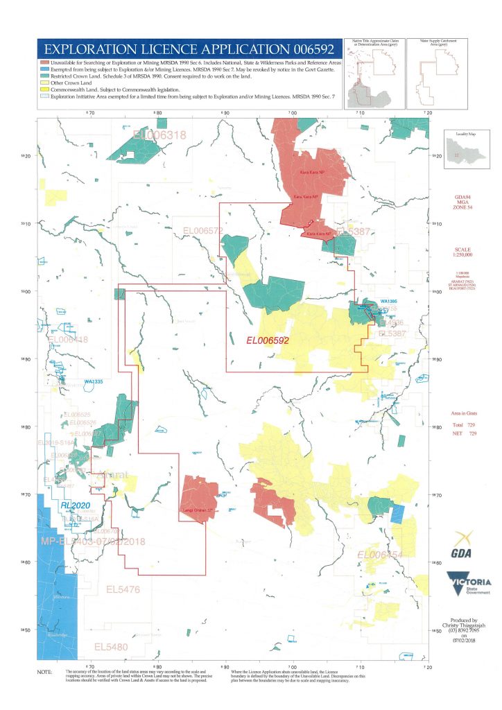 Locality of the land to which the application relates: From west of Buangor, then north west through to Ararat, continuing north, west from Bulgana then west below Joel Joel, then positioned north of Elmhurst, west of Avoca and south from Barkly. Approximate area of the application: 715 square kilometres